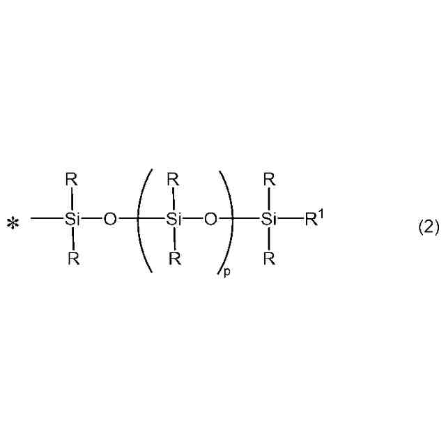 (式中、Rは上記と同じであり、q=1~5、rは0~100の整数であり、qで括られたシロキサン単位の位置は、分子鎖途中のどこであってもよい。*は上記式(1)のそれぞれ異なる*と結合する遊離基である。)
