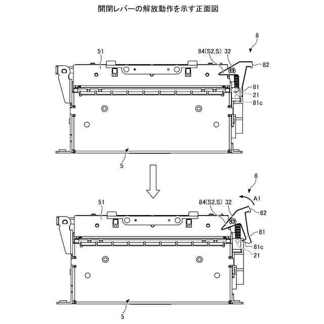 特許文献1に記載されたプリンタは、使用中に記録紙の咬み込みが発生した場合に、レバー部を操作することなくロック機構を解除しても開閉扉が開かないおそれがある。また、特許文献1に記載されたプリンタの連動機構は、多数の部品を含み、構成が複雑である。