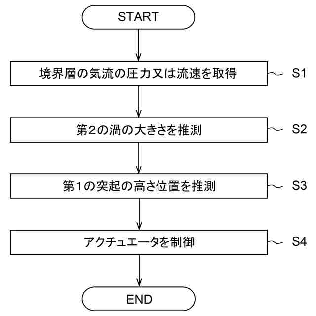 前記境界層における前記気流の状態に基づいて、前記第1の突起を前記車体の上下方向に移動させるアクチュエータをさらに備える、