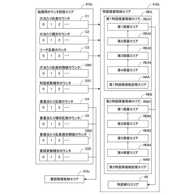 図1に示す遊技機の主制御装置の記憶領域の一例を示すブロック図。