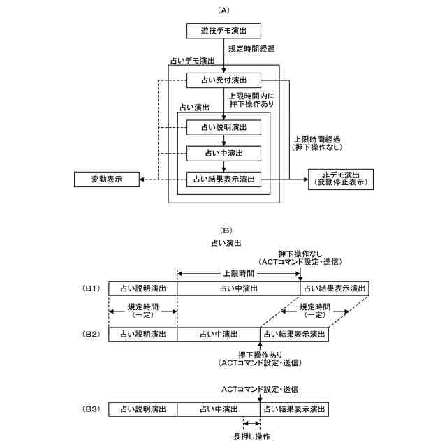 【解決手段】飾り図柄が変動していない状態において、占い中演出が上限時間の経過により終了する第1の場合と、占い中演出が上限時間の経過前の操作ボタン20に対する押下操作によって終了する第2の場合とで、同じACTコマンドを音声ランプ制御装置5から表示制御装置6を送信することで占い中演出から同じ1種類の占い結果表示演出に切り替える。占い結果表示演出は飾り図柄の変動開始により表示されなくなる。表示制御装置6は、第1の場合及び第2の場合の何れであっても、ACTコマンドを受信することに基づいて、占い結果表示演出の表示期間として同じ期間の表示を行う。