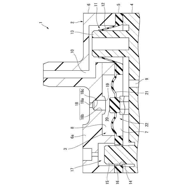 差圧弁によって開閉される排出通路を備えた従来の排気通路構造としては、例えば特許文献1に記載されたものがある。特許文献1には、電子血圧計のカフに空気を供給するダイヤフラムポンプが開示されている。このダイヤフラムポンプは、停止時にカフとの間の空気通路から空気を排気するために排気弁を備えている。排気弁は、ポンプの吐出圧が低下することによって排気通路を開く構造が採られている。排気通路は、ポンプの外壁を貫通する貫通孔によって形成されている。この排出通路は、上流端から下流端まで通路断面積が一定となるように形成されている。