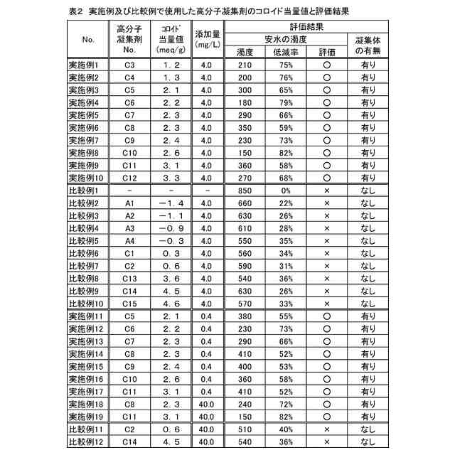 【解決手段】コークス炉ガスを安水で洗浄及び冷却することで発生した、懸濁物質及び油分を含有する安水に、高分子凝集剤を存在させることを含む、安水中の懸濁物質及び油分の除去方法である。前記懸濁物質が、石炭由来の粉体を含み、前記油分が、タールを含む。前記高分子凝集剤のpH4におけるカチオンコロイド当量値が、1.0~3.5meq/gである。