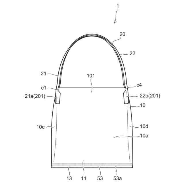 好適には、前記鞄本体は、前記収容空間の上方の開口を構成する略矩形の上部周縁部を有し、前記上部周縁部における4つの隅部を一方周りに順に第1隅部、第2隅部、第3隅部および第4隅部とした場合、前記第1ハンドル部分の一方の端部は前記第1隅部に接続され、他方の端部は前記第3隅部に接続され、前記第2ハンドル部分の一方の端部は前記第2隅部に接続され、他方の端部は前記第4隅部に接続される。これにより、第1ハンドル部分と第2ハンドル部分との両方を持つことで、鞄本体の略矩形の上部周縁部の4つの隅部に対して対角どうしを吊り上げるようになって、鞄をバランス良く持つことができる。