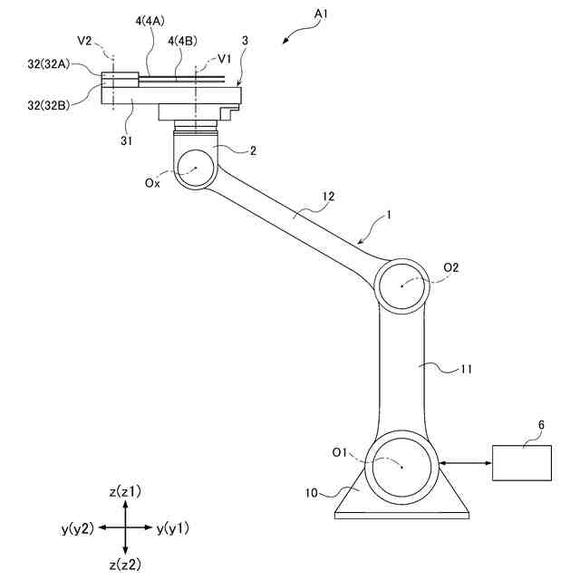 水平な第1方向に対して直交する面内方向に沿って移動する垂直多関節型の垂直アーム機構と、
