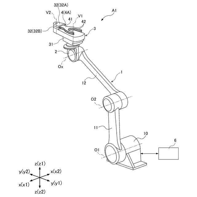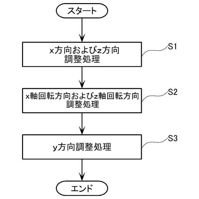 好ましい実施の形態においては、前記制御装置は、前記投光部からの光が前記第1面および前記第2面を通過する第3状態から、前記ハンド部を前記第1方向に延びる中心軸線の周りに回動させ、且つ前記ハンド部を前記中心軸線に直交し、且つ前記第1方向および前記第2方向に直交する第3方向に延びる鉛直軸線の周りに回動させて、前記第1受光部の受光量が最大となる第4状態までの前記ハンド部の前記中心軸線の周りの回動角度および前記ハンド部の前記鉛直軸線の周りの回動角度に基づき、前記ハンド部の前記中心軸線の周りの角度、および前記ハンド部の前記鉛直軸線の周りの角度を調整する。
