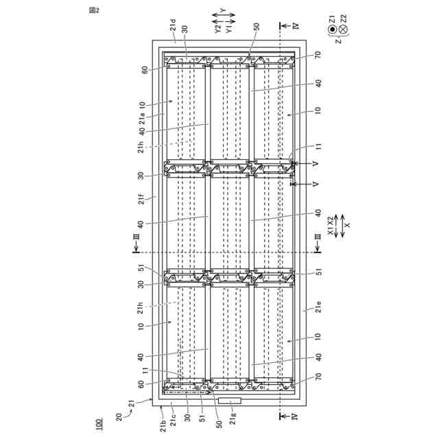 蓄電モジュールは、配列方向に配列された第1蓄電モジュール、第2蓄電モジュール、および、第3蓄電モジュールを含み、第2蓄電モジュールは、第1蓄電モジュールに対して配列方向の一方側に配置されており、第3蓄電モジュールは、第1蓄電モジュールに対して配列方向の他方側に配置されていてもよい。区画部材は、第1蓄電モジュールと第2蓄電モジュールとの間において配列方向と交差する交差方向に延びるように設けられた第1区画部材と、第1蓄電モジュールと第3蓄電モジュールとの間において交差方向に延びるように設けられた第2区画部材と、を含んでいてもよい。凹部は、第1区画部材と第2区画部材とを接続するように配列方向に延びるように形成された第1溝部を含んでいてもよい。このような構成により、第1蓄電モジュールから排出されたガスおよび煙を、第1溝部により、第1区画部材内の排煙経路および第2区画部材内の排煙経路の各々に導くことができる。その結果、第1溝部が第1区画部材内の排煙経路および第2区画部材内の排煙経路のいずれか一方のみと連通している場合に比べて、ガスおよび煙をより一層効率的に排気することができる。