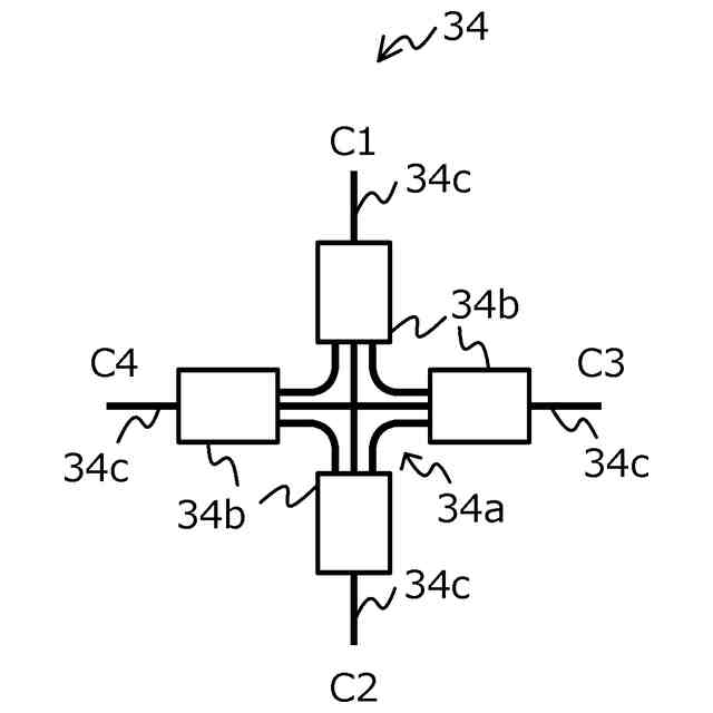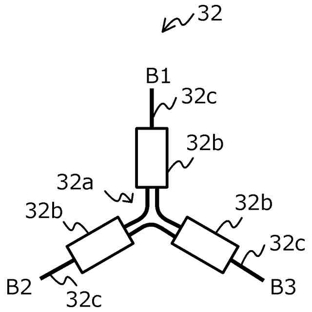 前記複数の1対2光分岐部の1入出力側と接続され、複数の前記1入出力側のうちのいずれかの1入出力側から入力された光信号を、前記複数の1入出力側のうちの他の1以上の1入出力側に出力するn(nは3以上の整数)差路光分岐部と、を備え、