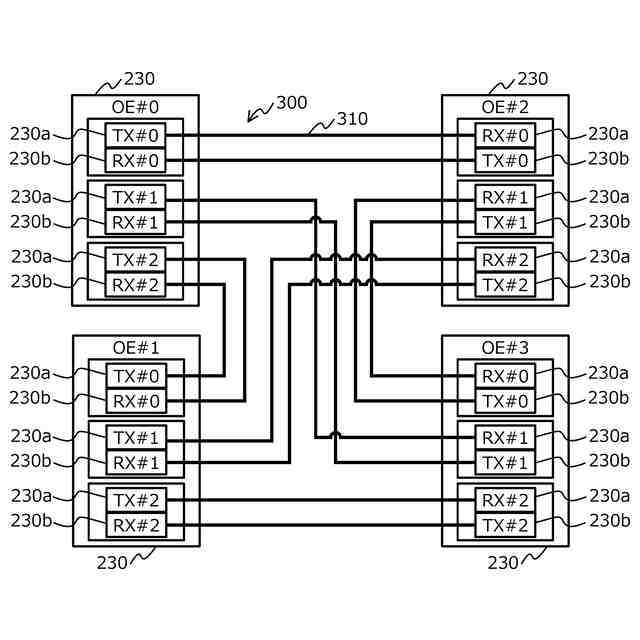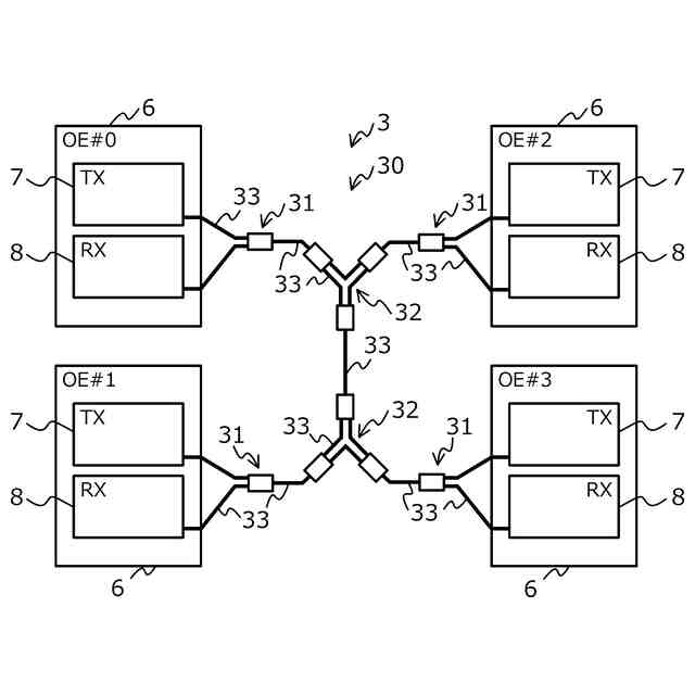 このような制限を軽減又は解消するために、チップレット間を、電気配線よりも長距離化の影響が小さい光導波路の配線により接続(全接続)することが考えられる。例えば、IOダイの送信部と他のIOダイの受信部とが1本の光導波路により1対1で接続され、当該IOダイの受信部と当該他のIOダイの送信部とが1本の光導波路により1対1で接続される。すなわち、相互に通信する2つのチップレット間は、それぞれが一方向に光信号を伝送する2本の光導波路により接続される。この場合、パッケージには、相互に通信するチップレットの組み合わせの数×2本分の光導波路が実装される。