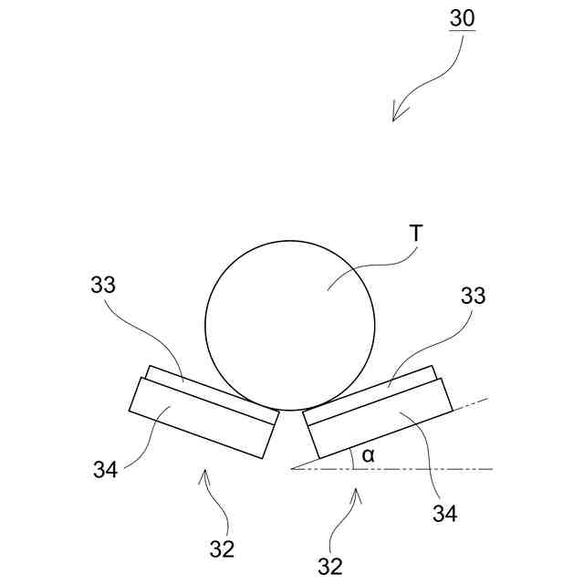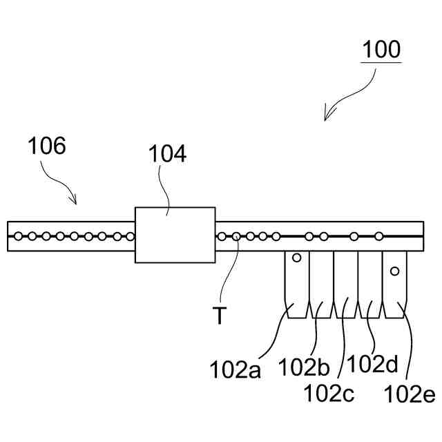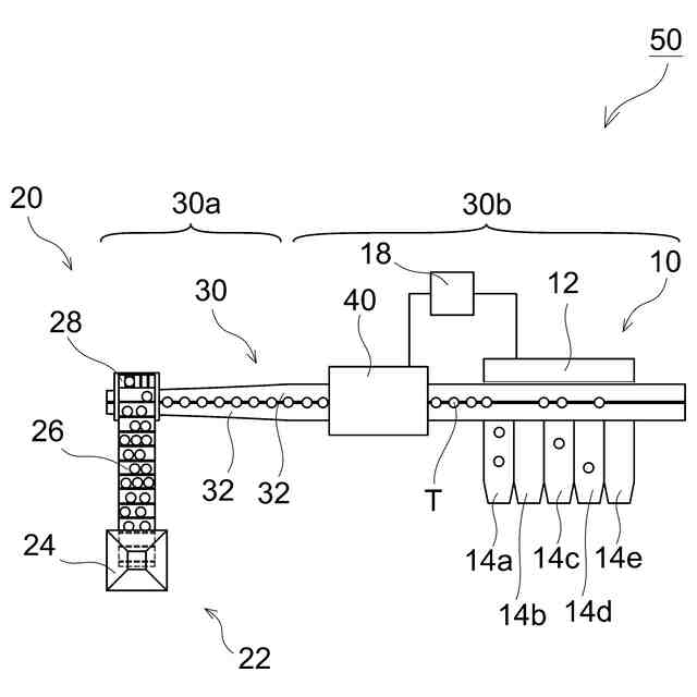このような選果装置100は、図4に示すように、例えば、外観検査装置や内部品質検査装置などの検査装置104と、搬送手段106と、複数の排出口102a~102eを備えており、検査装置104によって検査された青果物は、搬送手段106によって一方向に搬送され、検査装置104による検査結果に基づき、各排出口102a~102eに排出される。