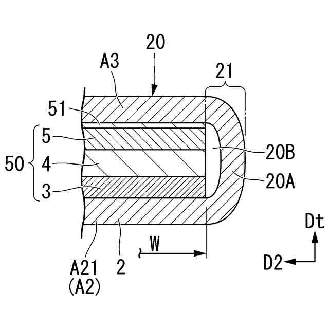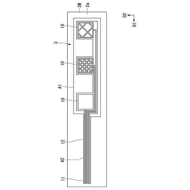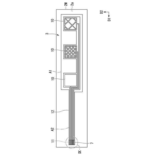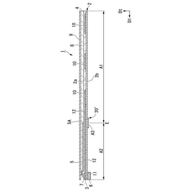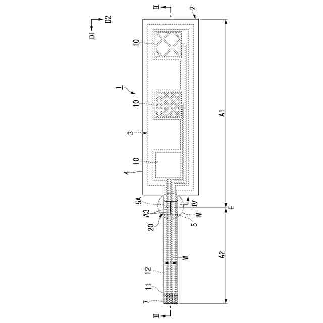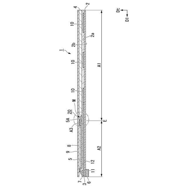 【解決手段】シート状の本体部A1と、前記本体部A1の平面視で前記本体部A1の一端から前記本体部1Aよりも狭い幅の形状で延びるテール部A2と、を有する基材2と、基材2の第一面に形成された導電層3と、前記導電層3上に重ねて形成された保護層4と、前記テール部A2上に位置する前記導電層3を覆い、本体部A1側の末端が、テール部A2上で前記テール部A2と本体部A1との境界線5Aを形成する剛性層5と、を有し、基材2は、平面視で境界線5Aを含む境界領域Eと重なる延伸抑制部20を備え、延伸抑制部20は、テール部A1の幅方向外側でテール部本体と折り返し部を介して連なっている。