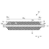 [10]シート状の本体部と、前記本体部の平面視で前記本体部の一端から該本体部よりも狭い幅で延びるテール部と、を有する基材を切り出す前の母材の第一面に、スクリーン印刷で導電層を成膜する工程と、
