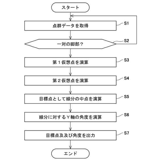 前記検出対象物が前記一対の脚部であると判定した場合に、前記点群データのうち前記一対の脚部の一方に対応する第1点群データのなかで、X軸方向において前記一対の脚部の他方に最も近い第1点のX座標を第1X座標とし、前記第1点群データのなかで、Y軸方向において前記キャリアパレット車に最も近い第2点のY座標を第1Y座標とする第1仮想点を演算することと、