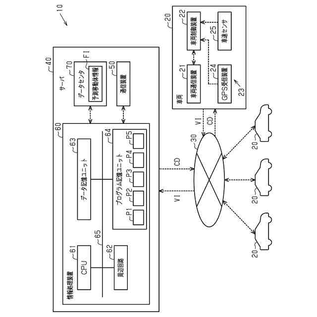 車両20は、車両通信装置21と、車両制御装置22と、複数の情報取得装置23と、を有している。車両通信装置21は、サーバ40と無線通信回線網30を介して無線通信によって通信する。車両制御装置22は、車両通信装置21の通信を制御する。