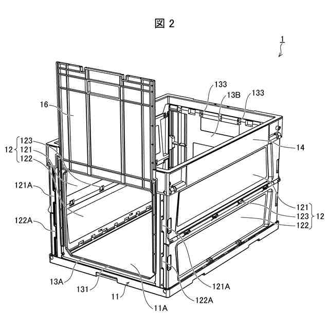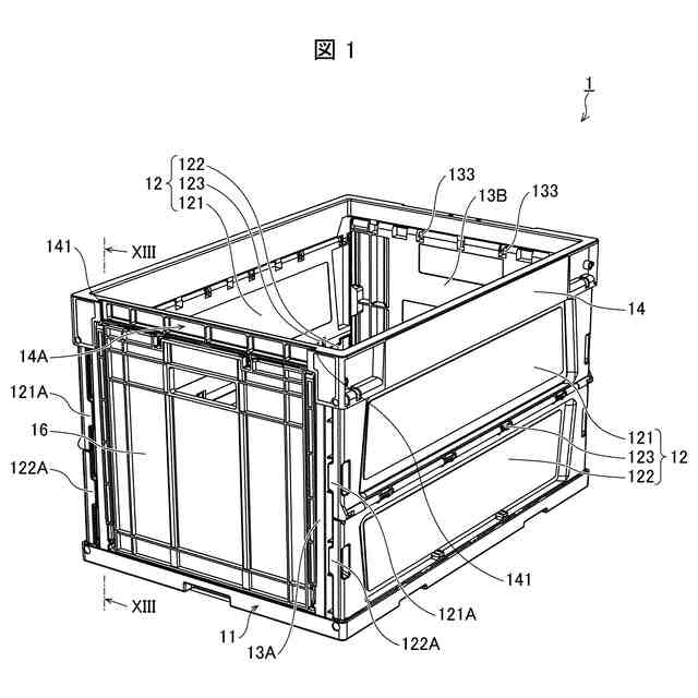 図1に示すように、容器1は、上面が開口した直方体形状であるとともに、図3に示すように折り畳み可能である。折り畳み可能な容器1は、例えばポリプロピレンからなる樹脂製である。