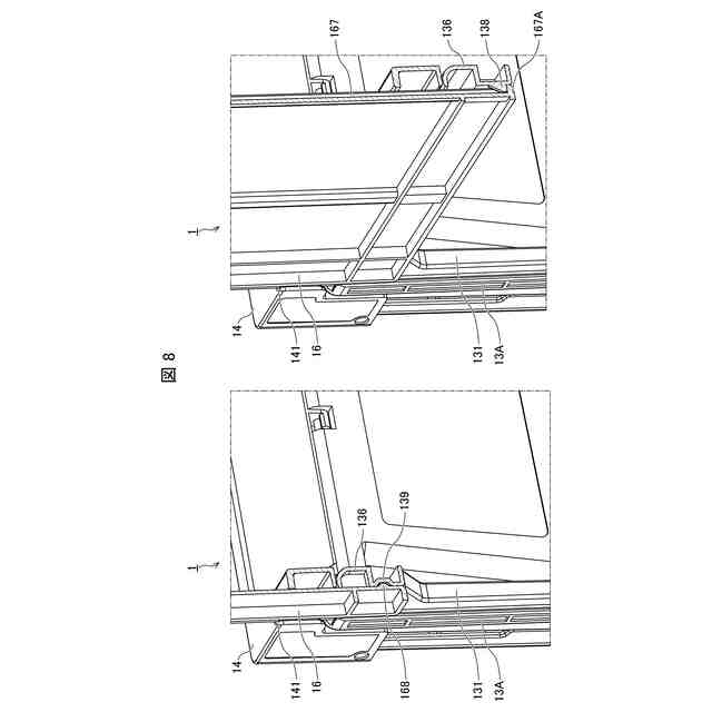 上枠部を上側から見た斜視図、および上枠部を上下反転した状態を示す斜視図と、B1部分の拡大斜視図である。