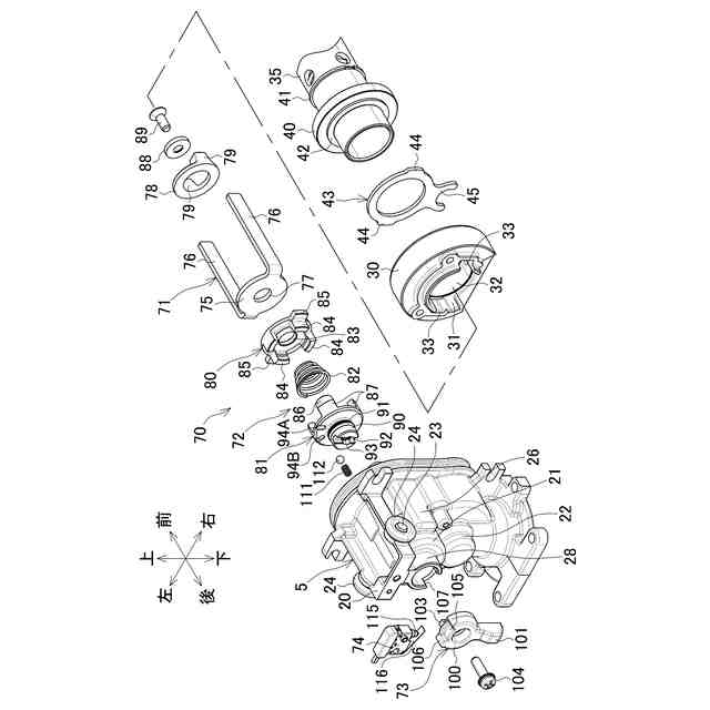 本体ハウジングを省略した操作レバー部分の背面図である(回転のみモード)。