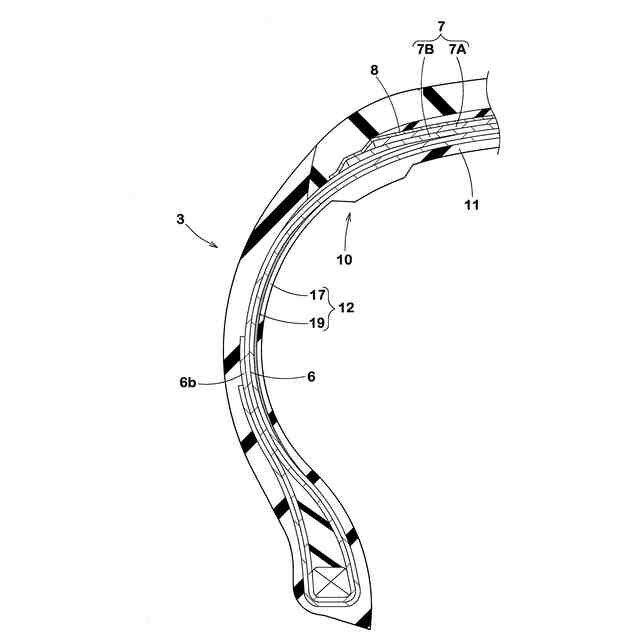 前記内側ゴムは、前記トレッド部を第1平均厚さで延びる第1部分と、前記一対のサイドウォール部を第2平均厚さで延びる第2部分とを含み、