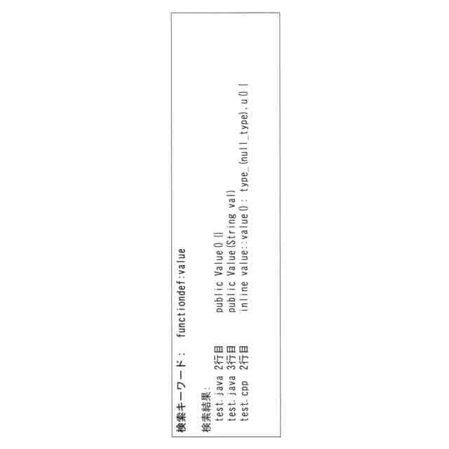 たとえば「value」という一般的な単語を検索キーワードとした場合、検索対象としたソースコードから「value」の箇所を同定して出力する。そのため、特定の開発言語のコマンドとしての「value」、関数として定義された「value」、ソースコード中にコメントとして記載した通常の英文の「value」など、さまざまな意味合いの異なる「value」が検索結果として出力されることとなる。