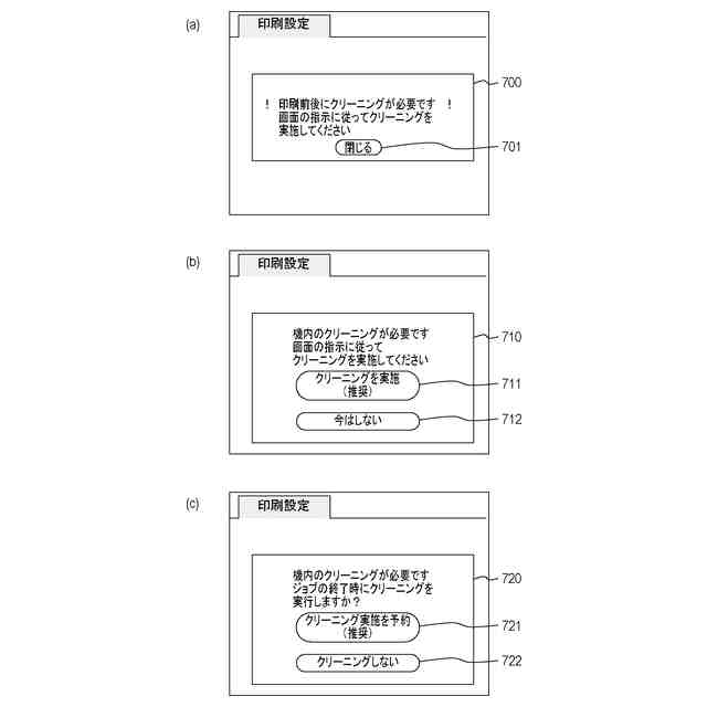 【解決手段】 本発明に係る画像形成装置は、記録材の縁部にトナー像を形成する縁なし印刷ジョブと記録材の縁部にトナー像を形成しない縁あり印刷ジョブとを実行可能な画像形成装置であり、非画像形成時に搬送される用紙により前記画像形成装置の内部を清掃する清掃動作を実行する実行手段(21)と、画面を表示する表示部(112)への表示を制御する表示制御手段と、縁なし印刷ジョブを受け付けると、前記表示制御手段は、印刷ジョブのジョブ情報に基づいて前記清掃手段の実行を促す警告画面(700)の表示を行うことを特徴とする。