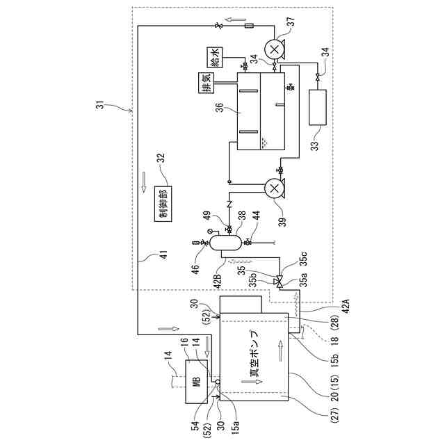 【解決手段】凝縮性ガス又は酸化粉塵を含むプロセスガスを排出する真空ポンプ15と、真空ポンプ15のガス流路内に堆積したプロセスガスの堆積物を除去する洗浄液を貯留する洗浄液貯留タンク36と、ガス流路の排気側から、洗浄液貯留タンク36内の洗浄液をガス流路に導入する洗浄液導入ポンプ37と、ガス流路の排気側から、ガス流路内の洗浄液を吸引し排出するバキュームポンプ39と、を備える。