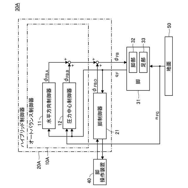 発明の詳細な説明【技術分野】 【0001】 本発明は、有脚ロボットに関し、特に、操作者の指令に基づいて脚を制御する脚制御器とバランス維持を自動で行うためのオートバランス制御器とを含むハイブリッド制御器を備えた有脚ロボットに関する。 続きを表示(約 3,000 文字)【背景技術】 【0002】 危険な環境下で人に代わって各種作業を行う有脚ロボットの実現が望まれているが、完全自律化には未だ多くの課題がある。このため、遠隔操作型の有脚ロボットの開発が進められている。遠隔操作型の有脚ロボットを操作する手法としては、例えば、非特許文献1に記載されたグラフィカルユーザインターフェース(GUI)を介して操作者が歩行経路を指令する手法や、非特許文献2に記載されたモーションキャプチャによって撮影された操作者の動きをロボットに反映させる手法等が知られている。 【0003】 有脚ロボットは一般に、多くの自由度を有する不安定な機構であり、基本動作の1つである歩行は転倒のリスクが高い。この課題に対しては、例えば、非特許文献3,4に記載された実時間で歩行パターンを自動的・自律的に生成する手法が有効である。しかしながら、この手法では、歩行のための脚の動きを逐一操作者が操作できるようになっていない。このため、この手法が適用された有脚ロボットは、建設現場や災害現場のような不整地を歩行する際に必要となる、操作者の判断による足の踏み替えを行うことができない可能性がある。 【0004】 このように、遠隔操作型の有脚ロボットは、操作者の意図通りに脚を動かし、かつロボット全体のバランス維持を自動で行うように脚を動かす制御器を備えていることが望ましい。このような有脚ロボットとして、例えば、特許文献1に記載されたものが知られている。この有脚ロボットは、トルク指令ベースのオートバランス制御器(すなわち、足関節にトルク指令を出力するオートバランス制御器)を備えている。そして、このオートバランス制御器は、操作者の指令に対応したトルク指令を出力する任意の脚制御器と組み合わせて使用することができるように構成されている。このオートバランス制御器によれば、脚制御器の出力がオートバランス制御器に干渉すること、すなわち、オートバランス制御器によるバランスを崩さない範囲で、操作者が脚を意図通りに動かすことができる。 【先行技術文献】 【非特許文献】 【0005】 S. Nakaoka, M. Morisawa, K. Kaneko, S. Kajita, and F. Kanehiro:“Development of an indirect-type teleoperation interface for biped humanoid robots,” Proceedings of 2014 IEEE/SICE International Symposium on System Integration, pp.590-596, 2014. I. Almetwally and M. Mallem:“Real-time tele-operation and tele-walking of humanoid robot NAO using Kinect Depth Camera,” Proceedings of 2013 10th IEEE International Conference on Networking, Sensing and Control, pp.463-466, 2013. J. Ding, M. Yang, J. Zhou, D. Yao, and X. Xiao:“Robust real-time walking pattern generation with dynamical consistency: An analytical method combined with optimal solution,”Proceedings of 2017 IEEE International Conference on Robotics and Biomimetics, pp.1806-1811, 2017. T. Sato, S. Sakaino, and K. Ohnishi:“Real-time walking trajectory generation method with three-mass models at constant body height for three-dimensional biped robots,”IEEE Transactions on Industrial Electronics, vol.58, no.2, pp.376-383, 2011. 【特許文献】 【0006】 特許第5268107号公報 【発明の概要】 【発明が解決しようとする課題】 【0007】 しかしながら、特許文献1に記載の有脚ロボットのオートバランス制御器は、ロボットに持続的な外力が加えられた場合を含む様々な状況において、バランスを維持することができない場合があった。 【0008】 本発明は、上記事情に鑑みてなされたものであって、従来よりも確実にバランスが維持された有脚ロボットを提供することを課題とする。 【課題を解決するための手段】 【0009】 上記課題を解決するために、本発明に係る第1の有脚ロボットは、胴体と、胴体に接続された脚と、脚を制御するハイブリッド制御器とを備えたロボットであって、 脚は、地面に接することができる足裏を有する足部と、脚部と、少なくとも1つの関節とを含み、 ハイブリッド制御器は、自動的なバランスの維持に関する第1トルク指令を出力するオートバランス制御器と、任意の制御に基づく第2トルク指令を出力する脚制御器とを含み、第1トルク指令および第2トルク指令が示すトルク量の合計を示すトルク指令を関節のアクチュエータが発生すべきトルクに関する指令として出力するように構成され、 オートバランス制御器は、第3トルク指令を出力する水平方向制御器と、第4トルク指令を出力する圧力中心制御器とを含み、第3トルク指令および第4トルク指令が示すトルク量の合計を示すトルク指令を第1トルク指令として出力するように構成され、 第3トルク指令は、胴体が足裏の略鉛直上方にあるようにするために関節のアクチュエータが発生すべきトルクに関する指令であり、第4トルク指令は、足裏が地面から受ける床反力の圧力中