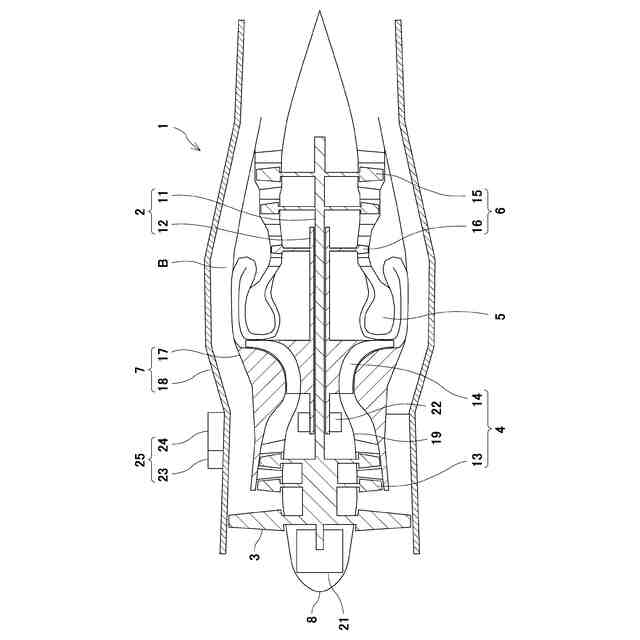 図1は、実施形態に係る航空機のガスタービンエンジン1の断面図である。なお、以下の説明では、「前方」はエンジン内で空気が流れる方向における上流側を意味し、「後方」はエンジン内で空気が流れる方向における下流側を意味する。
