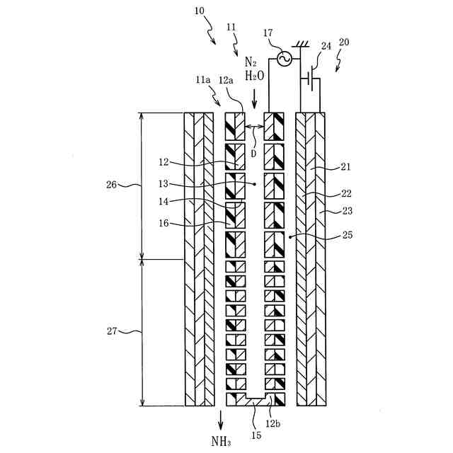 プラズマ発生装置を用いて励起した窒素と、水の電気分解で発生した水素と、の反応によってアンモニアを合成する先行技術は特許文献1に開示されている。特許文献2や非特許文献1にはプロトン伝導性の電解質を含む電気化学セルとプラズマとを併用したアンモニア合成に関する先行技術が開示されている。