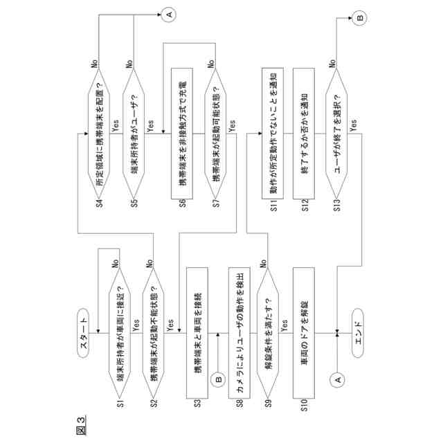 【解決手段】車両10のドアの解錠に用いる起動不能状態の携帯端末20が、施錠された車両10の非接触給電装置12に車両10の外側からかざされた場合に、車両10のセンサにより、携帯端末20を所持して車両10の外側にいる端末所持者が、予め登録された車両10のユーザであると判定されたときは、非接触給電装置12により携帯端末20を充電する。
