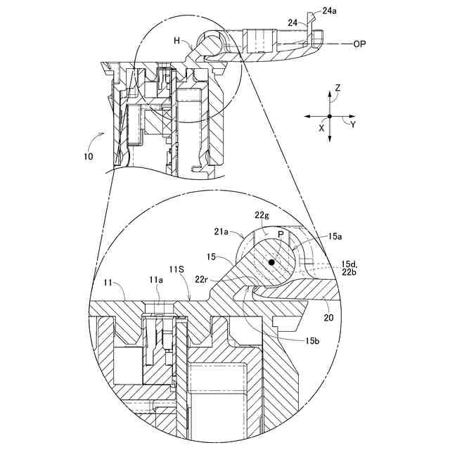 上記構成に加えた構成として、前記蓋体は、外周に沿う領域に前記ヒンジブロックが嵌まり込むヒンジ凹部を有し、前記第2軸孔は、前記ヒンジ凹部に前記ヒンジブロックを嵌め込んだ状態で前記第1軸孔と同軸心になり、前記当接部は、前記ヒンジ凹部に形成されていると好適である。
