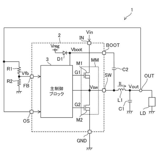 図1は、本開示の実施形態に係るDC/DCコンバータ1の全体構成図である。図1のDC/DCコンバータ1は、電源制御装置としての電源IC2と、電源IC2に対して外付け接続される複数のディスクリート部品と、を備え、当該複数のディスクリート部品には、出力コンデンサとしてのコンデンサC1と、ブートコンデンサとしてのコンデンサC2と、帰還抵抗としての抵抗R1およびR2と、インダクタL1とが含まれる。DC/DCコンバータ1は、外部から供給される入力電圧Vinより所望の出力電圧Voutを生成する降圧型のDC/DCコンバータとして構成されている。出力端子OUTに出力電圧Voutが生じる。即ち、出力端子OUTは出力電圧Voutの印加端(出力電圧VoutTが加わる端子)である。出力電圧Voutは出力端子OUTに接続された負荷LDに供給される。