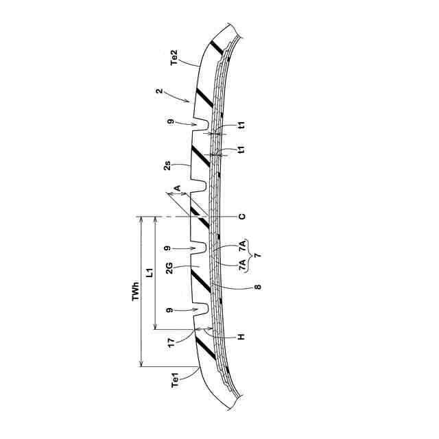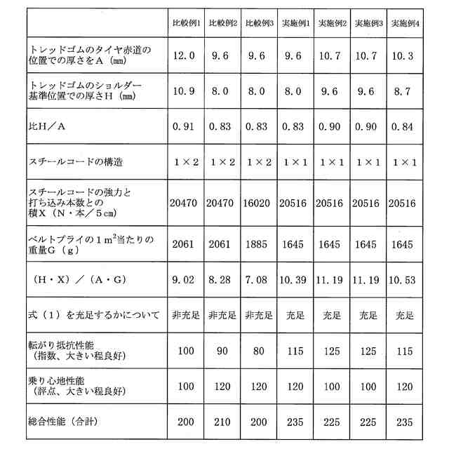 【解決手段】 本発明は、トレッド部2を有する空気入りタイヤに関する。トレッド部2は、トレッドゴム2Gとベルト層7とを含む。ベルト層7は、ベルトプライ7Aを少なくとも2枚含む。接地面2sは、トレッド半幅TWhと、ショルダー基準位置17とを含む。トレッドゴム2Gのタイヤ赤道Cの位置での厚さをA(mm)、トレッドゴム2Gのショルダー基準位置17での厚さをH(mm)、スチールコード12の1本の強力(N)と、ベルトプライ1枚の幅5cm当たりのスチールコード12の打ち込み本数(本)との積をX(N・本/5cm)、ベルトプライ1枚の1m