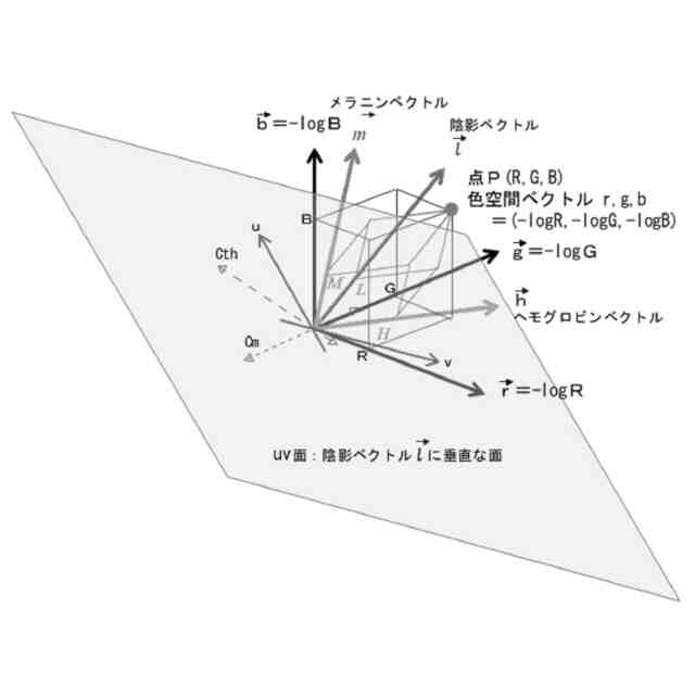 一般に、図1に示すように皮膚の内部反射光画像の点Pの画素値(R,G,B)に対し、直交座標の色空間ベクトルp(r,g,b)を(-log(R),-log(G),-log(B))で定義すると、適切に基本ベクトルを選ぶことで斜交座標の色空間基本ベクトル(色素成分ベクトル)であるメラニンベクトルm,ヘモグロビンベクトルh,陰影ベクトルl及びそれらの係数(M,H,L)が次式1で与えられ、この係数Mからメラニン分布を得られ、また係数Hからヘモグロビン分布を得られることが知られている。