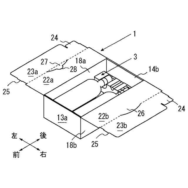 使用にあたっては、背面片上に上下位置を併せて二本の瓶を並べ置いて組み立てを行えば、二本の瓶は完成された箱本体内に収納され、上面部の内側折り返し片に形成した頭部挿通部に瓶の頭部が嵌挿されると共に、突合した係止分割片が瓶間に挿通され、各瓶の固定と互いの直接衝突を防止する(特許文献1参照)。
