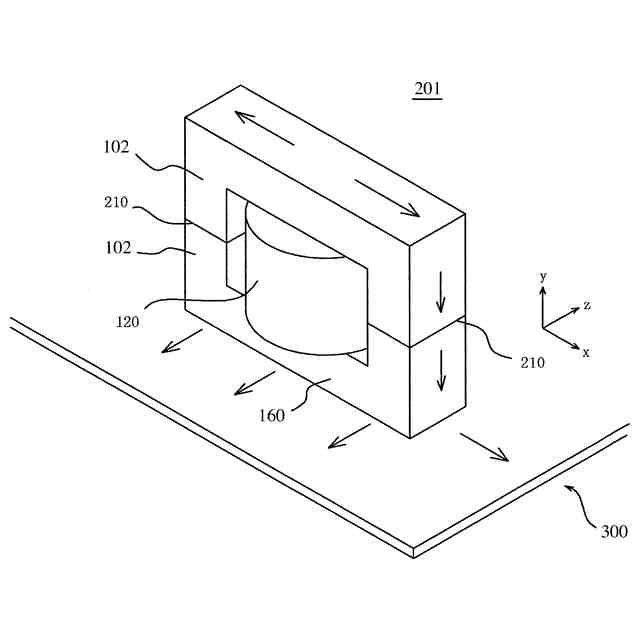 図9に示すように、コイル部品201と被装着体300との接触をフェライト磁心102の平板部160の背面で行うことは接触面積を広くとれるといった点で有利である。しかしながら、巻線120の径方向や幅方向(y軸方向)の熱経路には導線を保護する絶縁体により熱的なギャップが形成されるため、巻線120の径方向や幅方向の熱伝導は、巻回する周方向よりも劣ったものとなり易い。