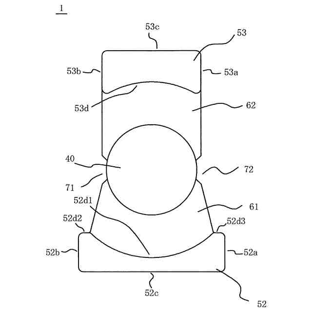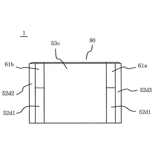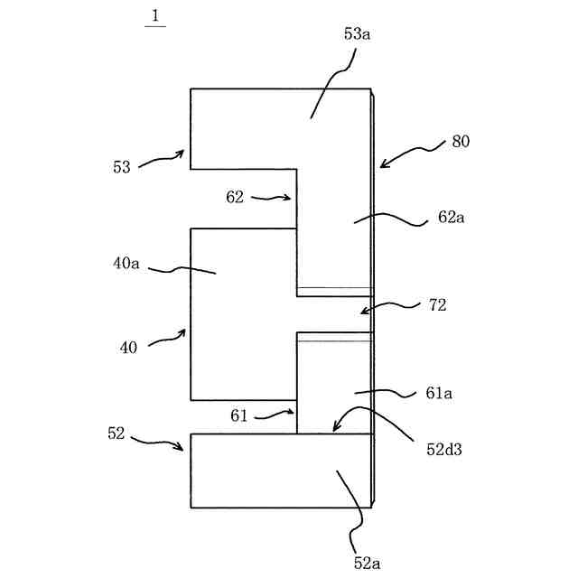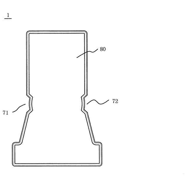 前記第1外脚部の、前記中脚部の中心を通るy軸方向の直線に沿った幅d1が、前記第2外脚部の、前記中脚部の中心を通るy軸方向の直線に沿った幅d2よりも小さく、