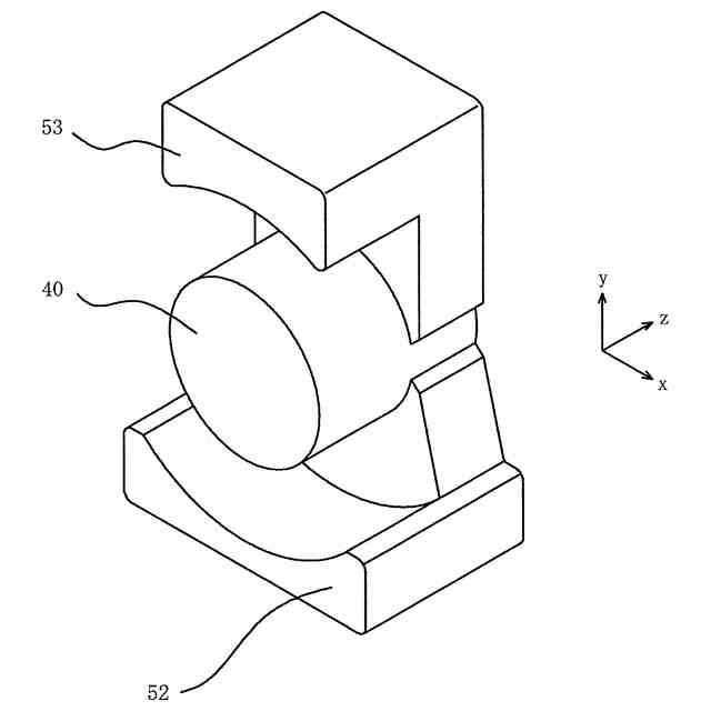 E型のフェライト磁心は、図10に示すように、長方形状の平板部160と、その平板部160の両端に突出して設けられた一対の外脚部152、153と、その間に設けられた中脚部140とを有する。E型のフェライト磁心101は平板部160の中央に立設する中脚部140の中心に対して回転対称の位置に外脚部152、153が設けられた対称形であるのが一般的である。