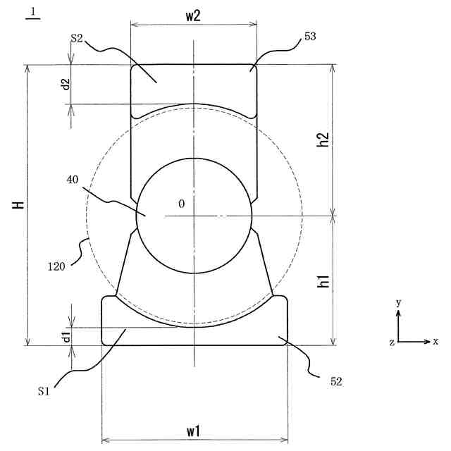 前記第1外脚部のx軸方向の幅w1が前記第2外脚部のx軸方向の幅w2よりも大きく、