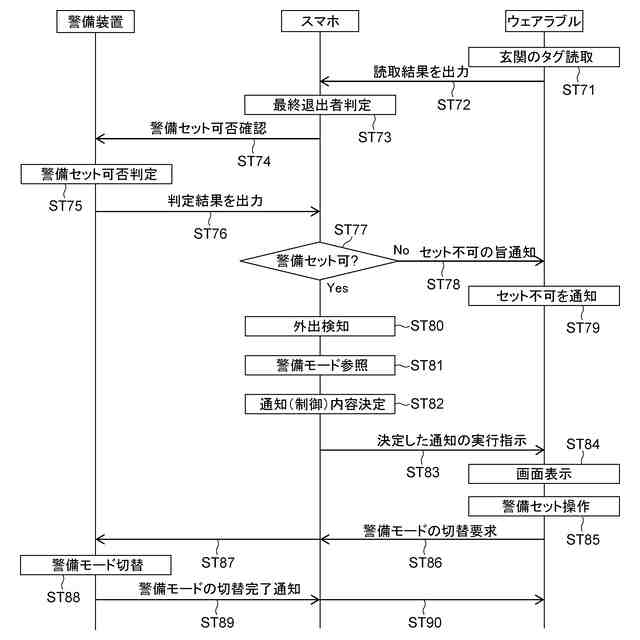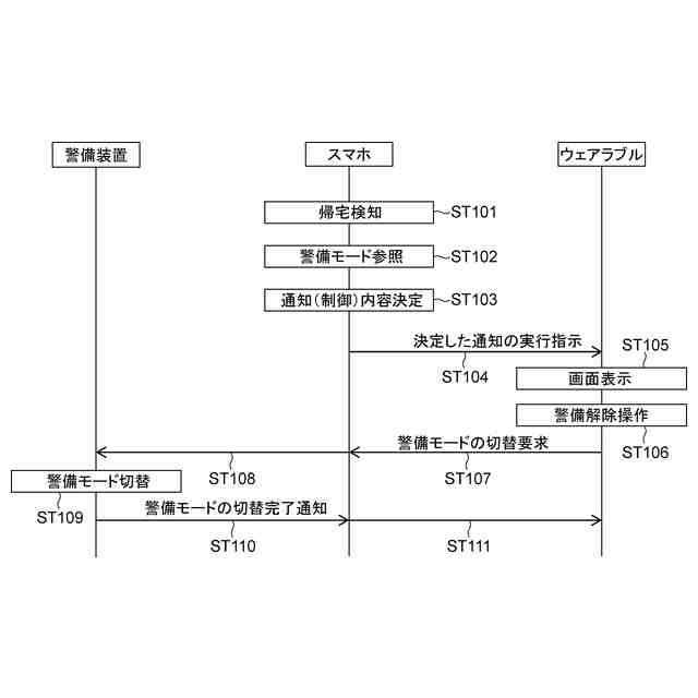 しかしながら、上記特許文献1等の従来技術においては、ユーザは、例えば帰宅時や外出時等、警備モードを切り替える必要がある場合には、携帯端末を操作して警備アプリケーションを起動し、モード切替のための操作画面を表示させて、当該操作画面上で切替先の警備モードを選択するという煩雑な操作が必要となる。このような操作は、例えばユーザが手荷物で手が塞がっていたりバッグの中に携帯端末を収納したりしている場合等にはユーザに特に煩わしさを感じさせることになる。