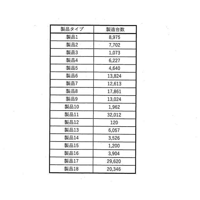、少なくとも、種類ごとの前記製品の製造台数と、前記製品を製造するために必要な複数