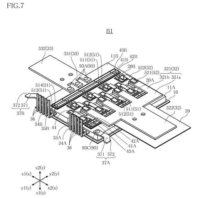 第1方向の一方を向く素子主面に形成された第1電極および第2電極と前記第1方向の他方を向く素子裏面に形成された裏面電極とを各々が有し、各々が前記第2電極に入力される信号に応じて前記第1電極と前記裏面電極との間のスイッチング動作を行う複数のスイッチング素子と、