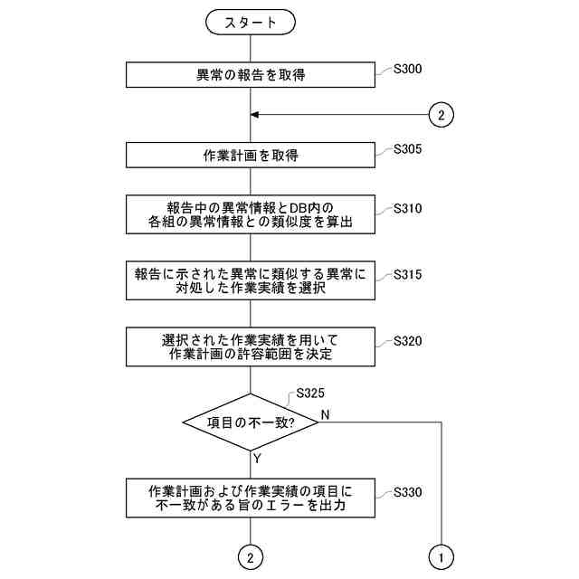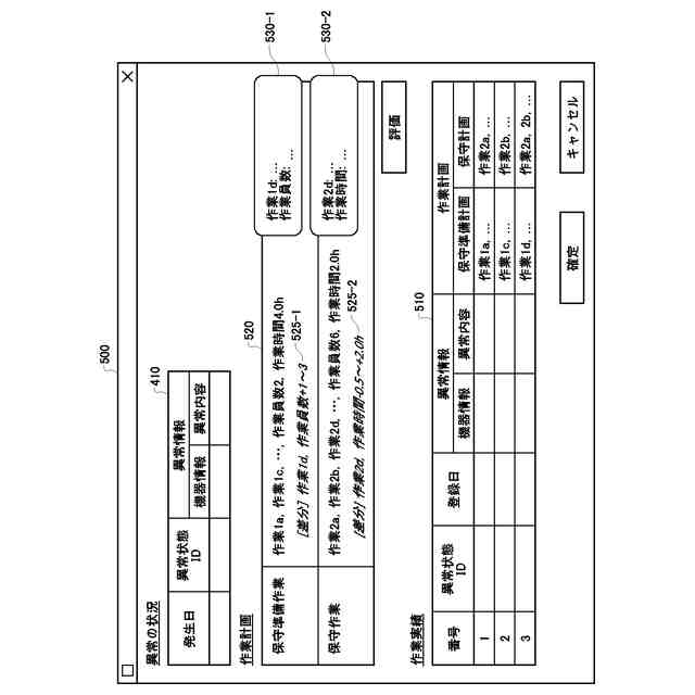 【解決手段】装置100は、設備に発生した異常についての異常情報および当該異常に対処した作業実績をそれぞれ含む複数の組を記憶するデータベース130に接続されるデータベース接続部140と、設備に発生した異常の報告を取得する報告取得部120と、設備に発生した異常に対処する作業計画を取得する作業計画取得部165と、報告中の異常情報および複数の組のそれぞれに含まれる異常情報の類似度を算出する類似度算出部155と、類似度算出部により算出された類似度に基づいて複数の組の中から少なくとも1つの組を選択する選択部160と、作業計画および少なくとも1つの組の作業実績の差分を検出する差分検出部174と、差分を表示する表示処理を行なう表示処理部180と、を備える。