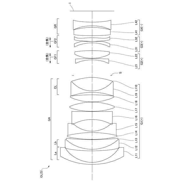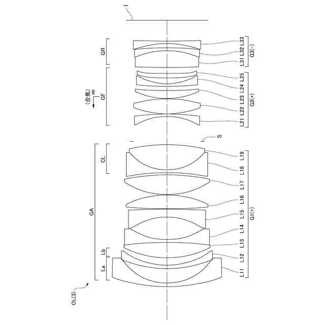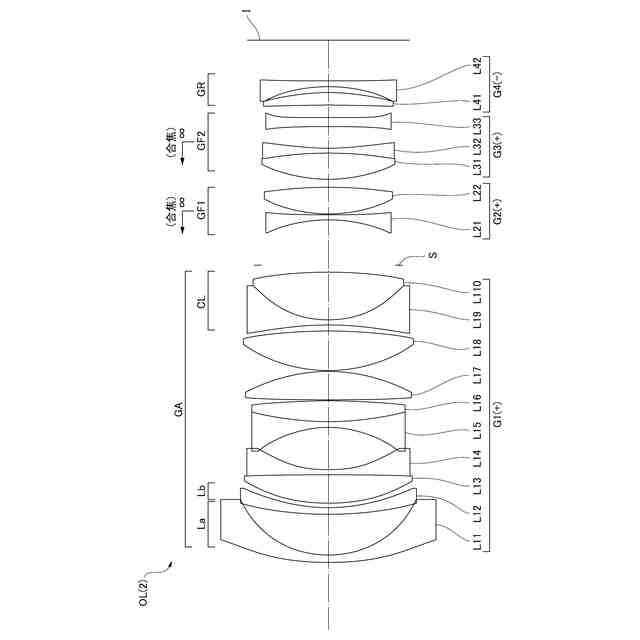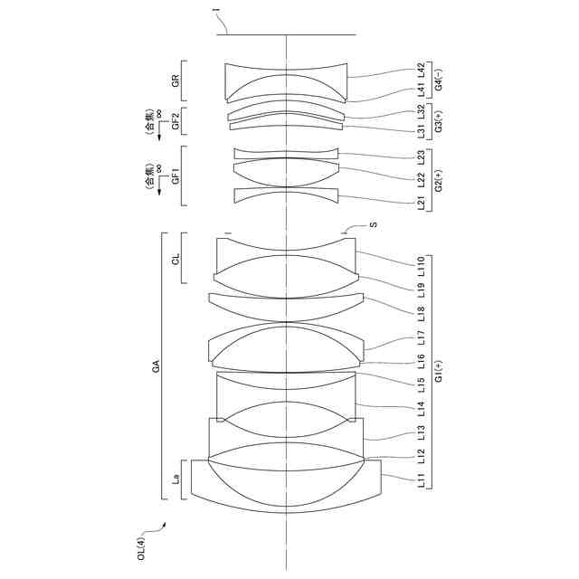 次に、本実施形態に係る光学系について説明する。本実施形態に係る光学系OLの一例としての光学系OL(1)は、図1に示すように、光軸に沿って物体側から順に並んだ、正の屈折力を有する物体側レンズ群GAと、正の屈折力を有する少なくとも1つの合焦レンズ群(GF1,GF2)と、後続レンズ群GRとを有して構成される。合焦の際、前記少なくとも1つの合焦レンズ群が光軸に沿って移動し、物体側レンズ群GAと後続レンズ群GRとが像面Iに対して固定される。また、本実施形態に係る光学系OLは、物体側レンズ群GAよりも像面側に配置された開口絞りSをさらに有している。