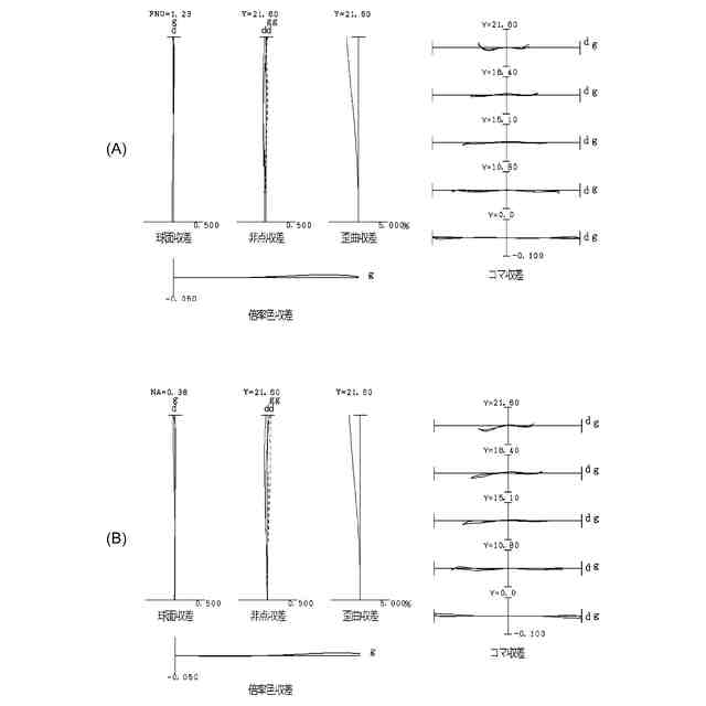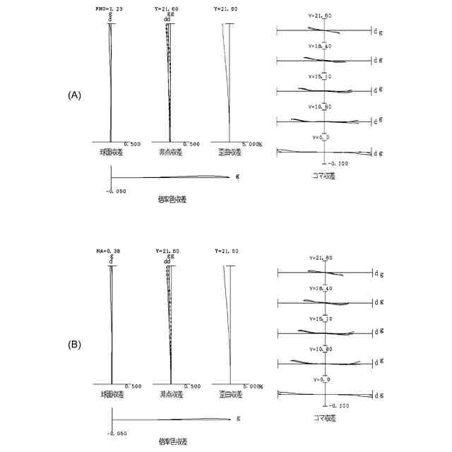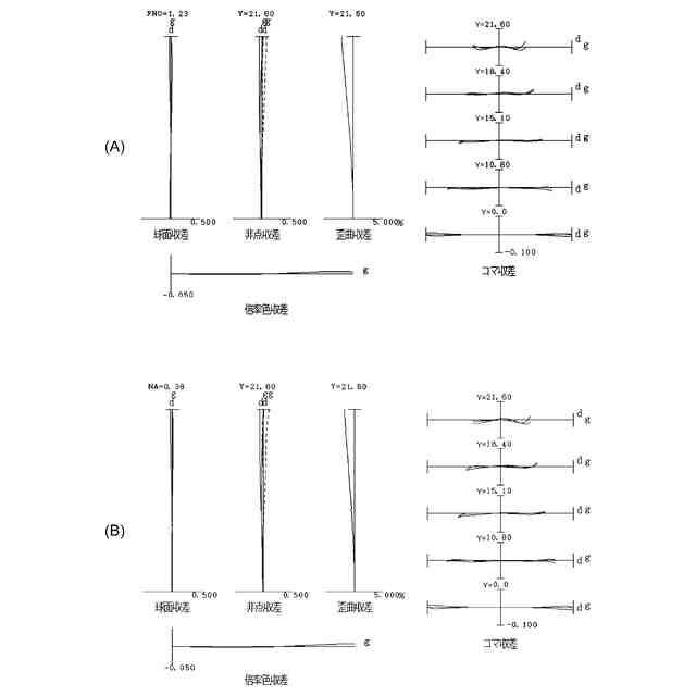 図2(A)、図2(B)はそれぞれ、第1実施例に係る光学系の無限遠合焦時、近距離合焦時の諸収差図である。