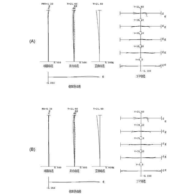 図4(A)、図4(B)はそれぞれ、第2実施例に係る光学系の無限遠合焦時、近距離合焦時の諸収差図である。