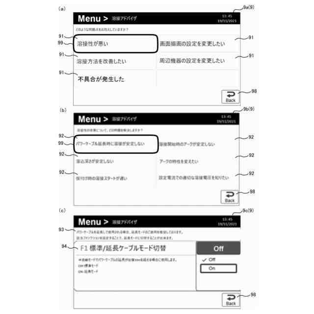 本発明の好ましい実施の形態においては、前記表示制御部は、前記第2画面で、複数の前記詳細な問題点のなかから、パワーケーブル延長時に溶接が安定しないことが選択された場合、前記第3画面に、前記パワーケーブル延長時に使用することで安定した溶接が行えるモードである延長モードの使用を提案する記載を表示させ、前記延長モードの使用または不使用を選択する操作のための操作表示を表示させる。