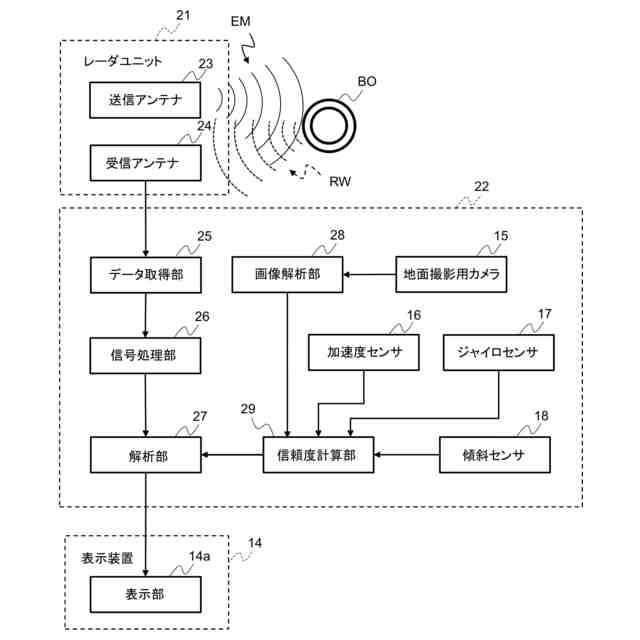 図1は、本発明の実施形態に係る地中レーダ装置の概略構成を示している。この地中レーダ装置10は、地中にパルス状の電磁波EMを放射しつつ矢印方向に移動し、比誘電率の異なる材質の境界面で反射された反射波RWを受信して地中の埋設物BOの探査を行うものである。そして、車輪11やこの車輪11の駆動機構(図示せず)を持った移動本体12に、ハンドル13が取り付けられた構成になっている。移動本体12には、地面撮影用カメラ15、加速度センサ16、ジャイロセンサ17及び傾斜センサ18が搭載されている。