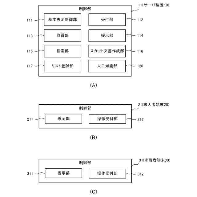 サーバ装置10(制御部11)、求人者端末20(制御部21)及び求職者端末30(制御部31)によって実現される機能を示すブロック図である。