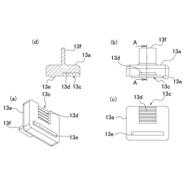 上側のクランプ片の部品図である。このうち、(a)は全体斜視図、(b)は側面図、(c)は底面図、(d)は縦断面図である。