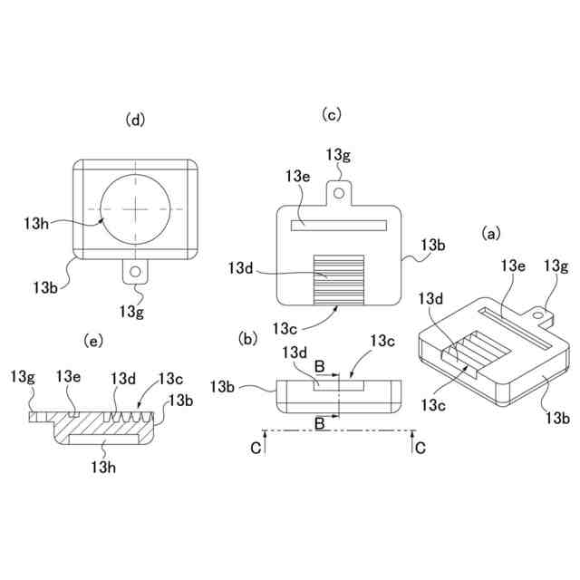 下側のクランプ片の部品図である。このうち、(a)は全体斜視図、(b)は側面図、(c)は上面図、(d)は底面図、(e)は縦断面図である。